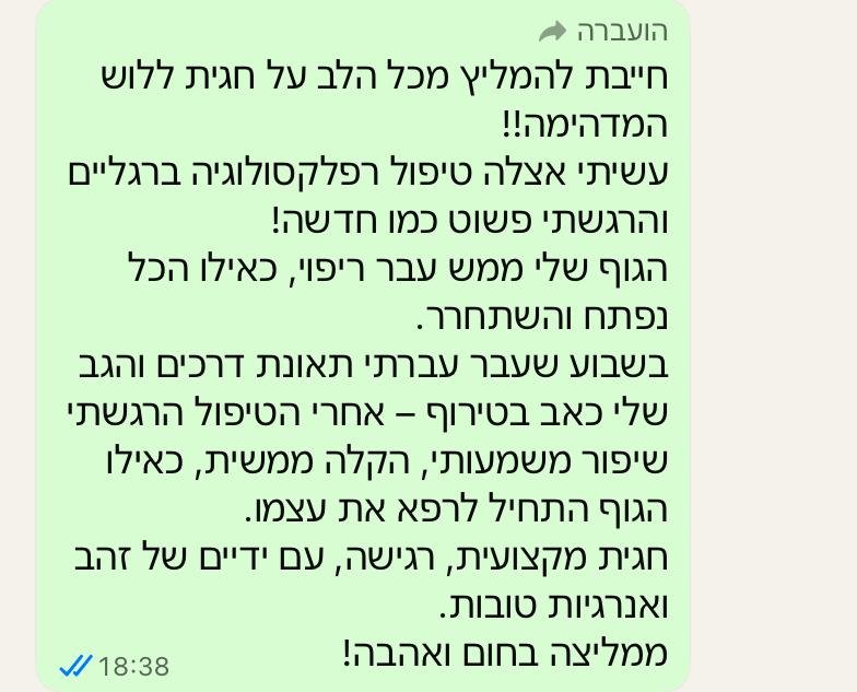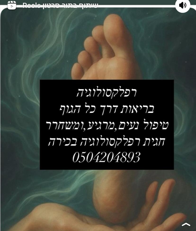 טיפול דרך נקודות לחיצה בכפות הרגליים המשפיעות על מערכות הגוף השונות. הרפלקסולוגיה מסייעת לאיזון הגוף, להפחתת מתחים, שחרור חסימות אנרגטיות והקלה בכאבים פיזיים ונפשיים, תוך יצירת תחושת רוגע עמוקה.